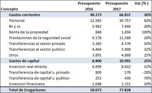 En cuanto a los gastos públicos, los mismos se prevén en $77.828 millones, lo que implica una ampliación del 34% respecto al presupuesto 2016. Excluyendo las prestaciones de la Seguridad Social, la variación es 36% superior. Del total de erogaciones el Gasto Corriente representa un 85,9% y el de Capital el 14,1%. Las erogaciones Corrientes se estima se incremente en un 38%, esta variación se explica principalmente, por el aumento del gasto en personal, del 43% respecto al monto estimado en el presupuesto 2016. Se destaca un alza en Rentas de la Propiedad, de un 100% respecto al ciclo anterior, por el mayor peso de los intereses correspondientes a la emisión de títulos y letras en los últimos años, y en menor medida, por préstamos contraídos con el Banco de la Nación Argentina y el Nuevo Banco de Entre Ríos. El aumento en Otros Gastos Corrientes, que corresponden principalmente al registro de las pérdidas operativas resultantes del programa de sorteos y premios del IAFAS 25%. Asimismo, las Transferencias Corrientes, que representan los fondos que conforman la masa coparticipable que se distribuye a los municipios, de acuerdo al régimen establecido en la Constitución Provincial, se proyecta un incremento del 32% respecto al presupuesto 2016 y las transferencias efectuadas a la educación privada para hacer frente a los salarios docentes, un crecimiento del 30%.