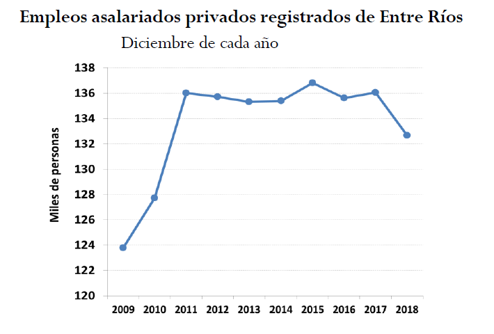 En Entre Ríos, el número de asalariados tuvo un aumento hasta el 2011, donde se estabiliza en 136.000. En ese momento los dos principales factores que explicaron el aletargamiento fueron el fin de la bonanza internacional y el comienzo del control cambiario y de capitales (“cepo”).