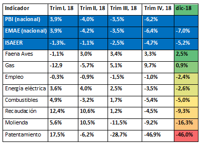 El Producto Bruto Interno (PBI) se contrajo -6,3% interanual los últimos tres meses del 2018 acentuando la baja sufrida en los periodos anteriores. En tanto, el Estimador Mensual de la Actividad Económica (EMAE) del INDEC, mostró que la caída fue del -7,0% interanual, es decir que el 2018 terminó con una tendencia negativa en términos de actividad económica.